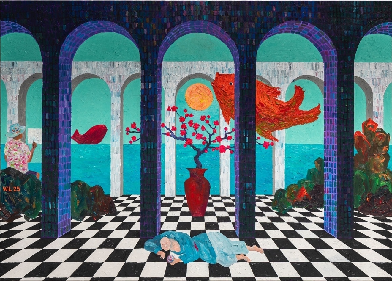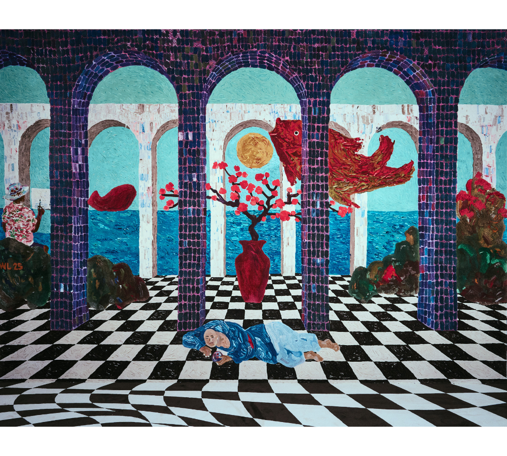 The painting, part of Lim’s Journey series, depicts a boy gazing into a crystal ball, imagining a world where fish leap across the sky and the moon hangs low, a hopeful meditation on perspective, symbolism and the meeting of reality and imagination. The installation brings the painting to life through symbolic motifs and decorative objects, offering a sanctuary where visitors are invited to inhabit a future bright with possibility.