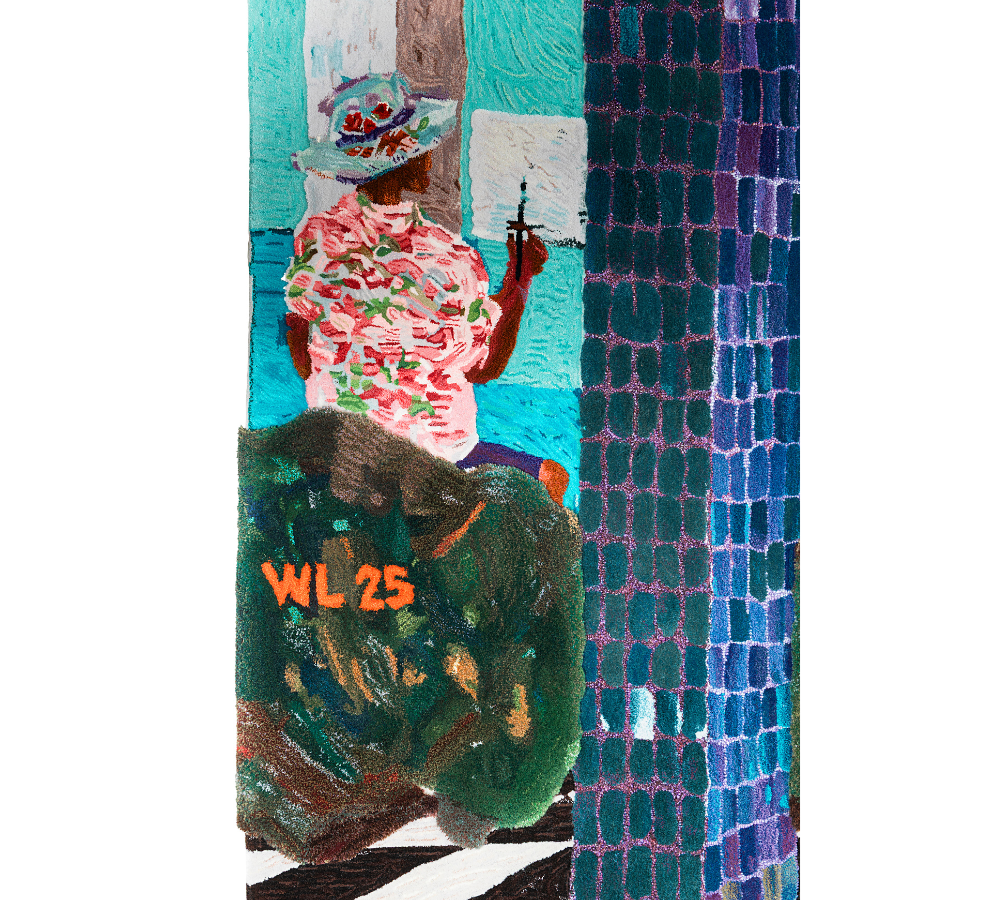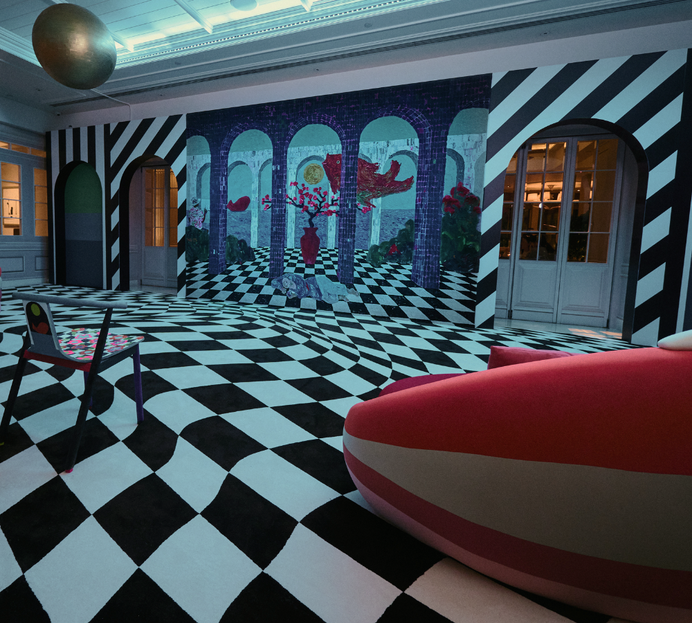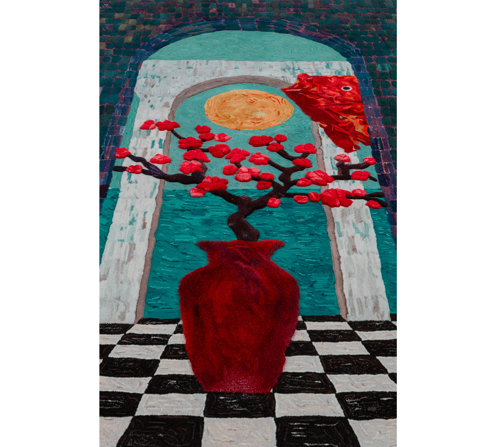 The installation is designed to be a spatial extension of the artist’s work, centred upon a 3M x 4.3M hand-tufted wall tapestry. This piece is a meticulous translation of Lim’s original oil-on-canvas painting into a rich textile medium. The experience is further enhanced by a hand-tufted floor carpet featuring a monochromatic checkered motif, which extends the visual narrative of the tapestry into the physical environment.