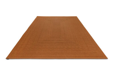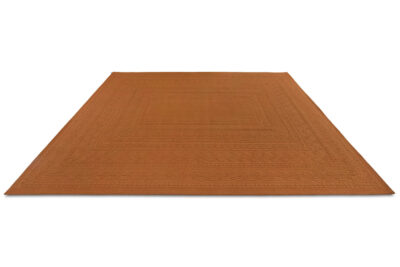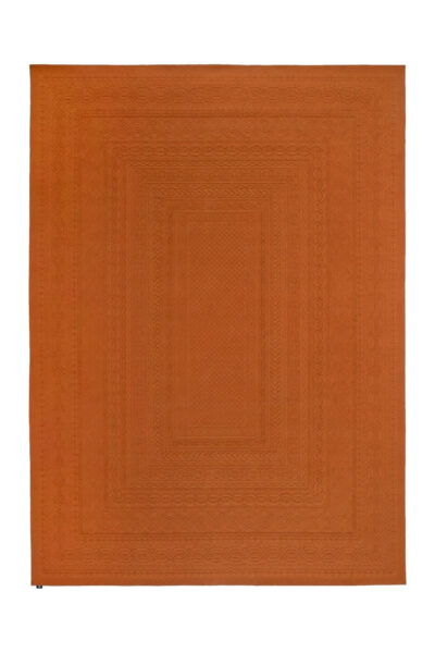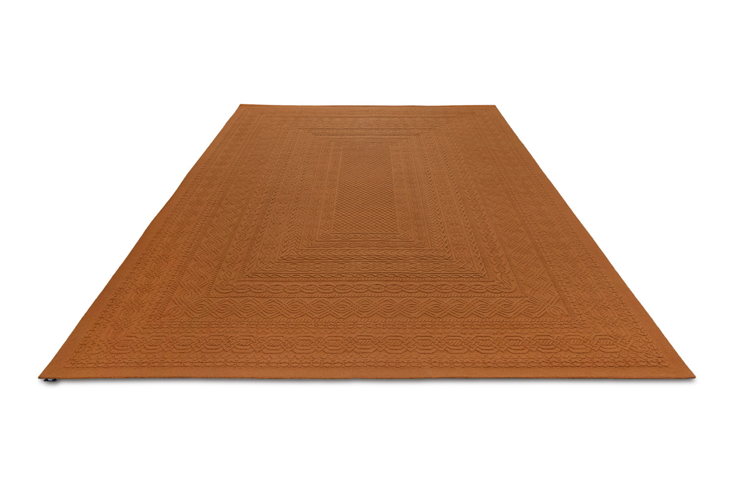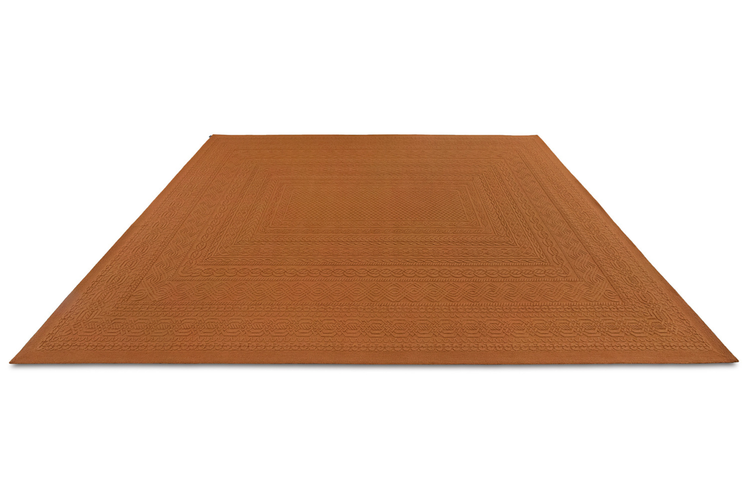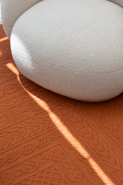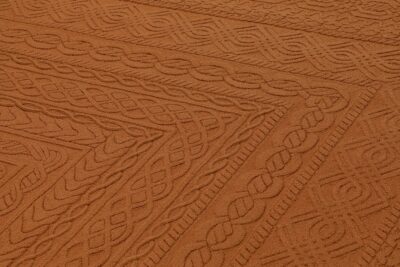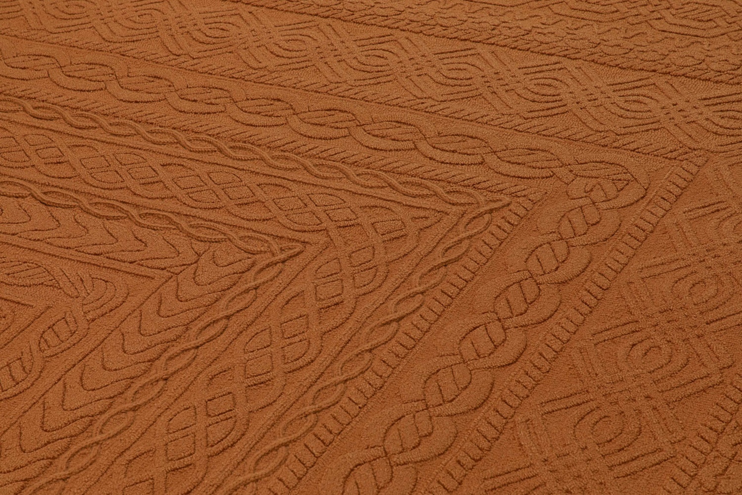 An features a burnt orange hue and a rectangular form, reminiscent of intricately knitted sweaters crafted with crochet and needlepoint accents. It evokes serenity and deep comfort through its soothing texture.
