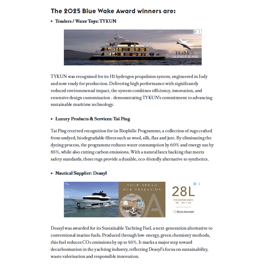 Boat International highlights the celebration of the winners of the Monaco Yacht Show new sustainability initiative: Blue Wake. The event welcomed over 400 guests, including Monaco officials, Blue Wake programme exhibitors, leading sponsors, private clients, and prominent figures from the yachting industry.
