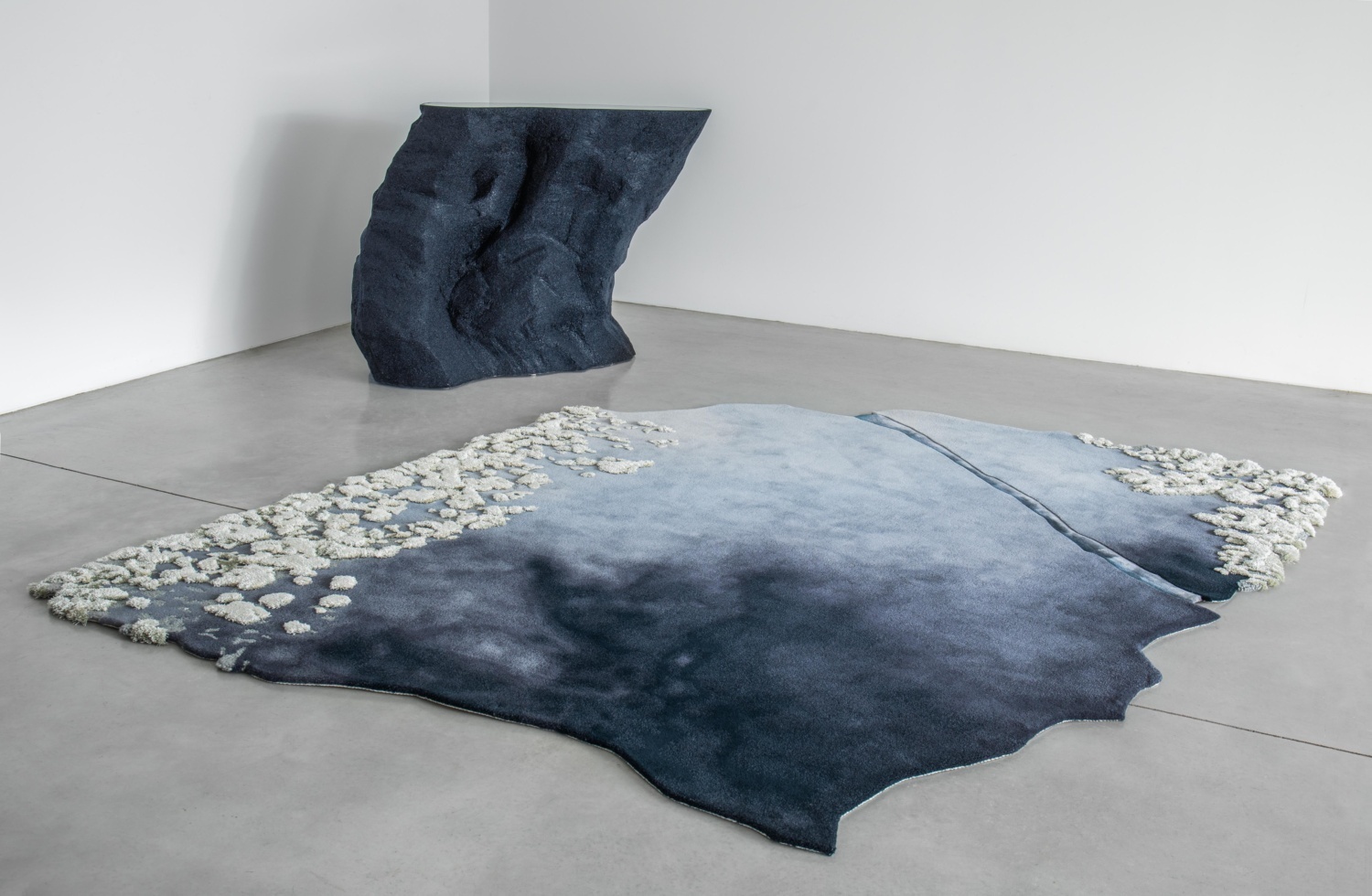 An homage to bleached coral reefs, this rug makes use of felted wool and silk to suggest aquatic vegetation on a now-broken shoreline. Pale, ivory tufts bloom out of a dynamic, inky background.