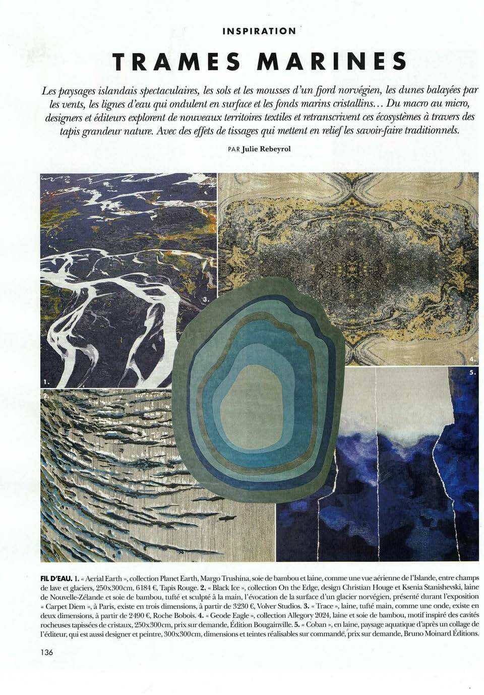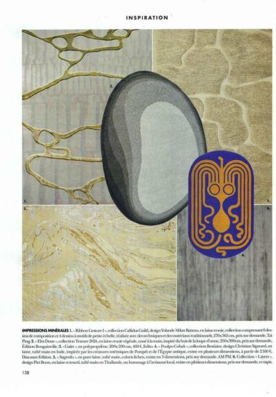 Côté Ouest features Ribbon Gesture I Agate from the Callidus Guild collection (Tai Ping), a rug designed by US artist Yolande Milan Batteau. The design is large scaled, where algae coloured bubbles float on a surface of striated abstractions in this meditation inspired piece. Ribbon Gesture is influence by the theme of koan “mu”.