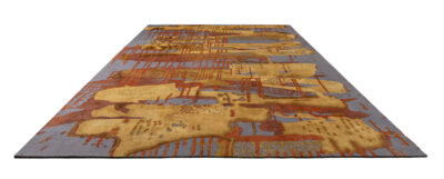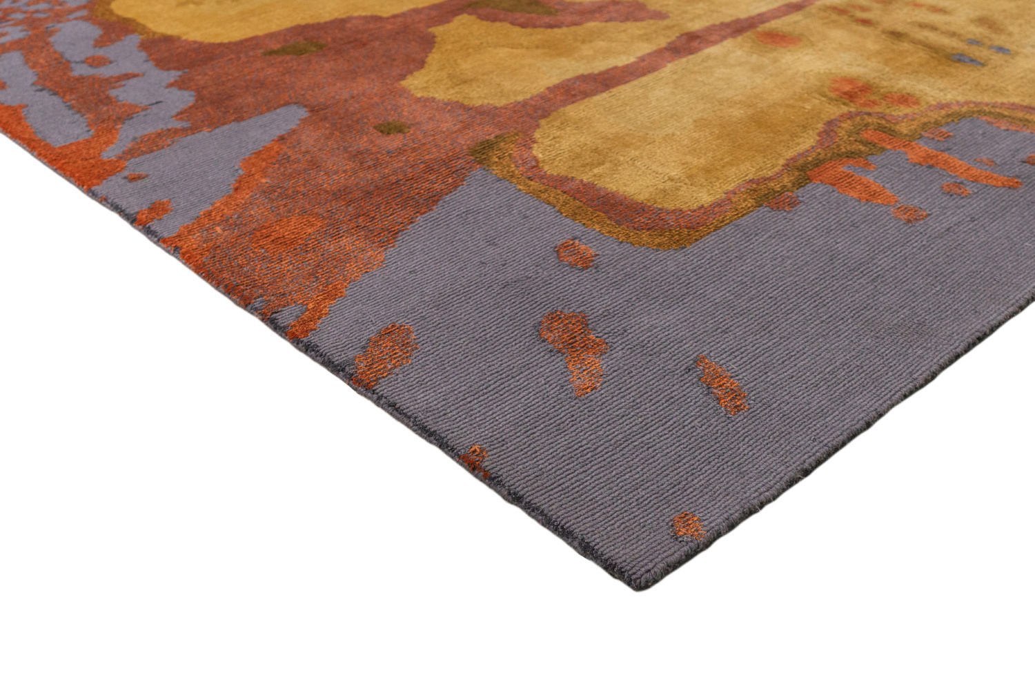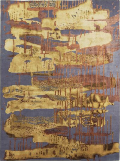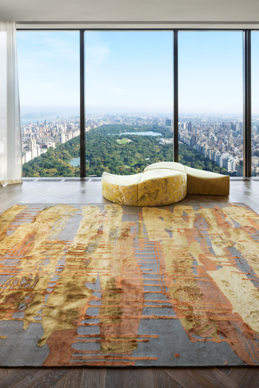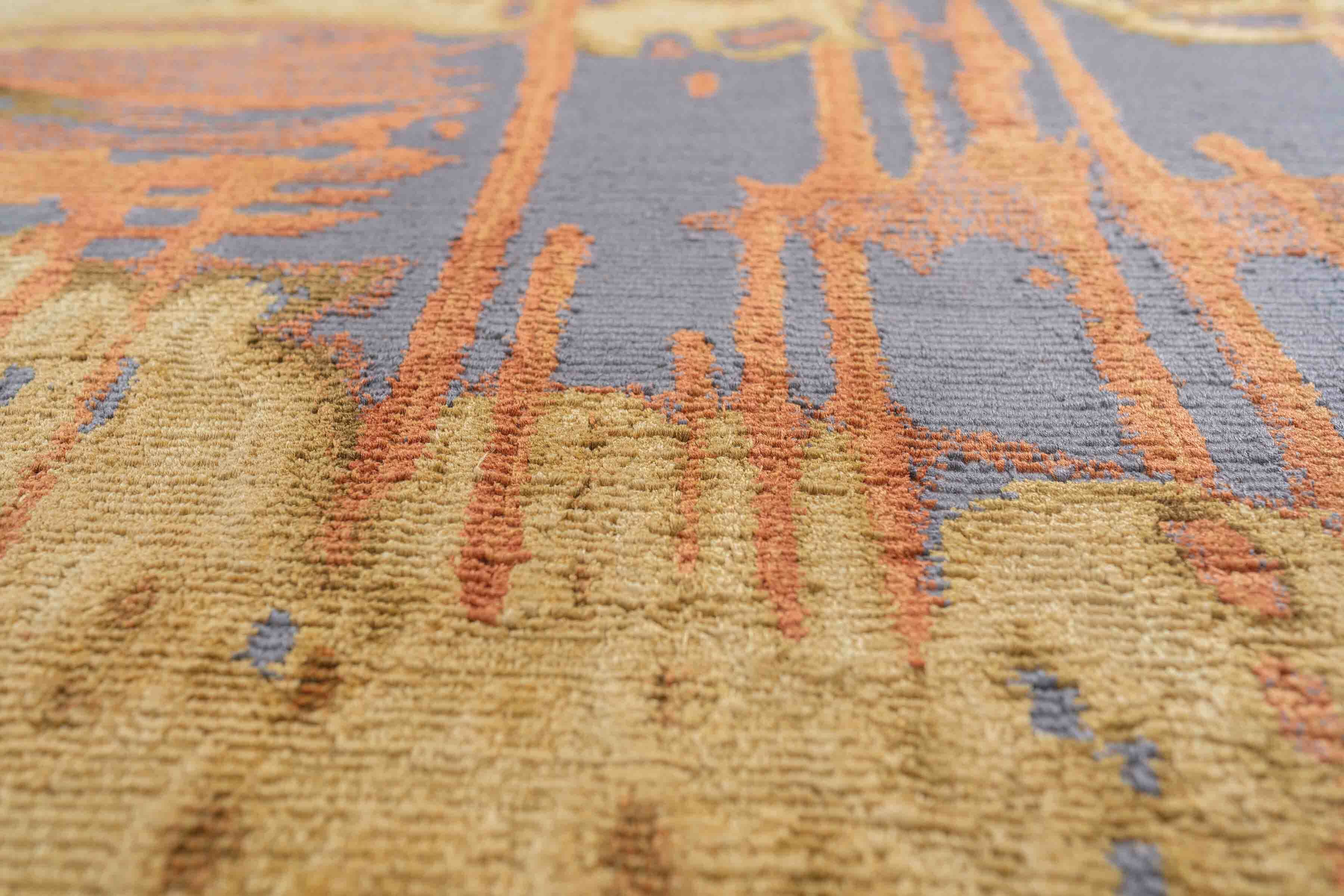 Interpreted in 100% silk, utilizing loop and cut pile techniques, this rug depicts a meditation-inspired gesture that seeks to capture nothingness. Terracotta lines drip down from bold golden strokes, creating a design reminiscent of clouds.