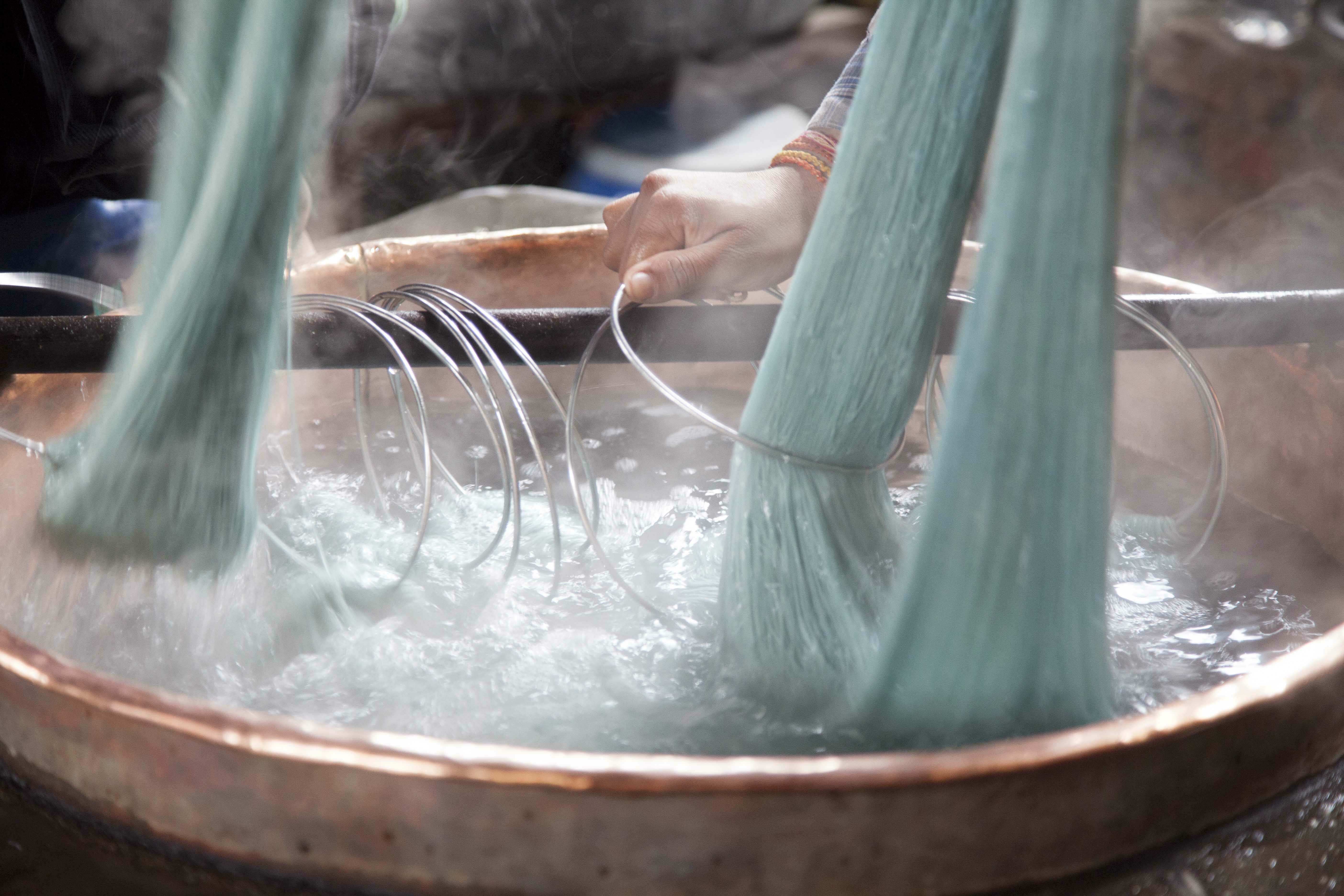 The wool is very rich in lanolin and by applying a lightly hand-wash the softness and impermeability characteristics of the lanolin are retained once dyed and woven