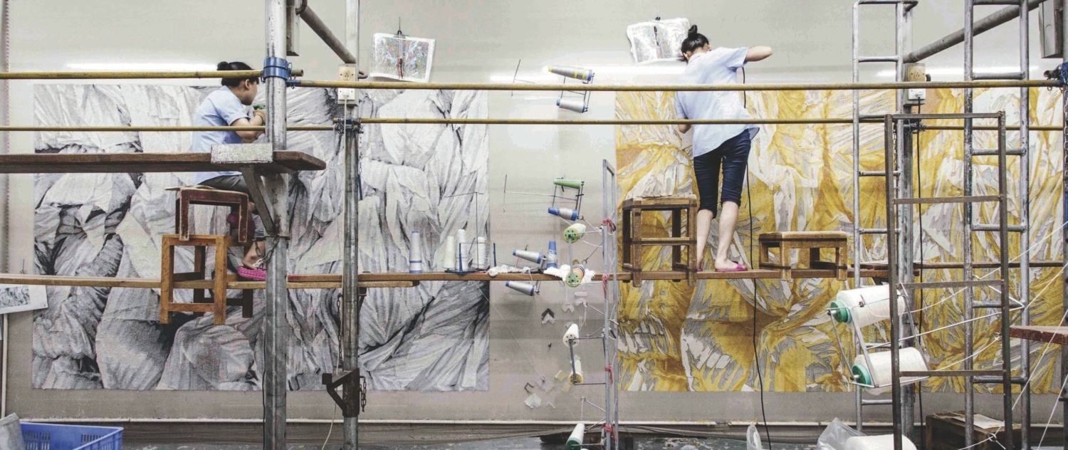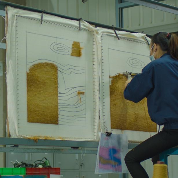 Once the inked canvas and dyed yarn preparation stages are complete, the carpet is created by skilled artisans with many years of training in the hand-tufting process. The canvas is stretched vertically, and the artisans use special hand-tufting guns designed by Tai Ping to apply the yarns to the canvas, with each colour applied individually in turn.