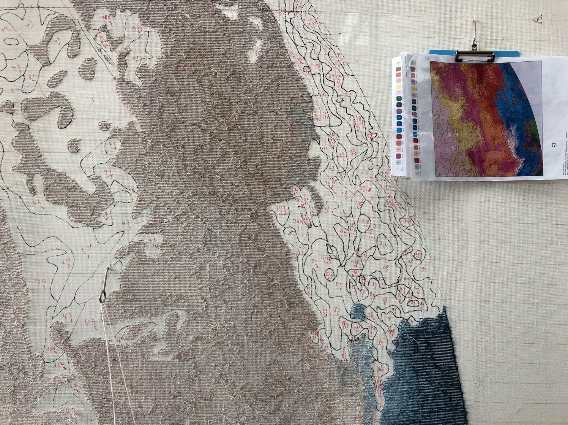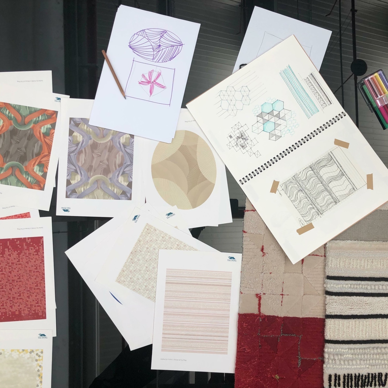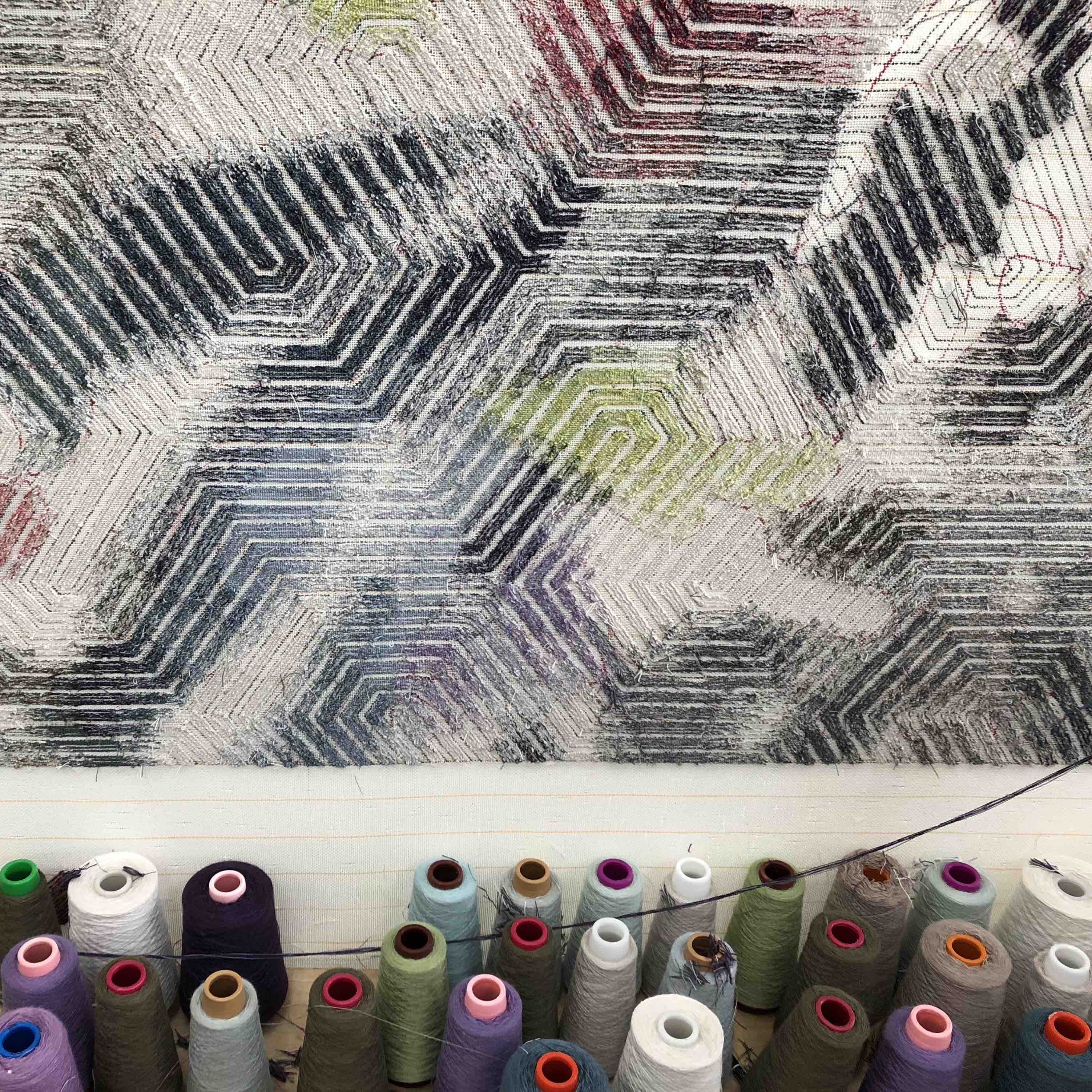 Each carpet design is entirely printed to scale and hand painted with contrasting ink colours to become the guiding map of the pattern.