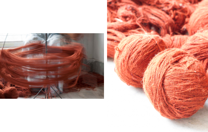 After the dyeing and air-dry process take place, every yarn combination is set in balls to use as the weft construction of the hand-knotted weave.