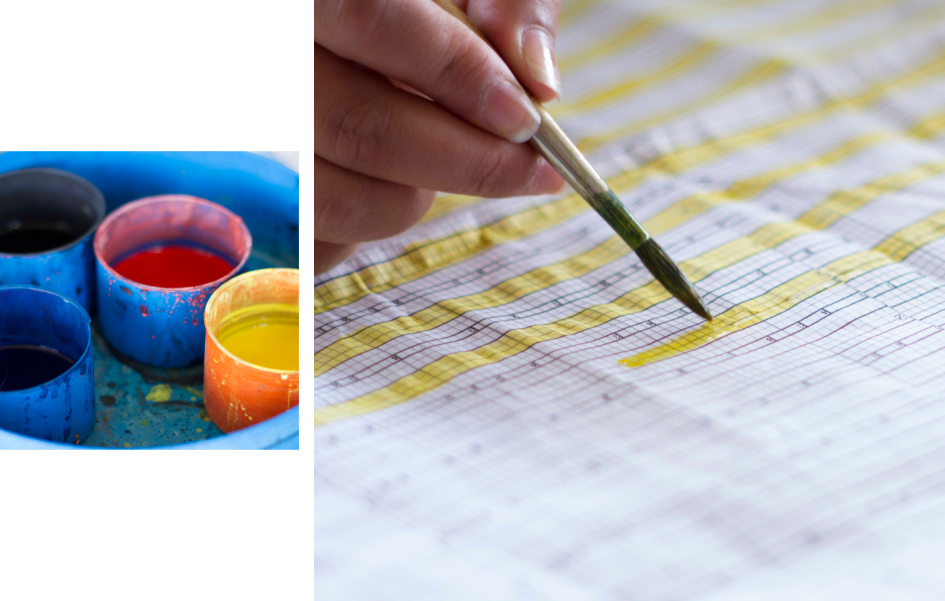 Once the template is prepared, it is attached to a large vertically stretched canvas, and the pattern outline is transferred to the canvas by brushing ink onto the acetate, which seeps through the holes. Then an artist finishes the pattern on the canvas by hand.