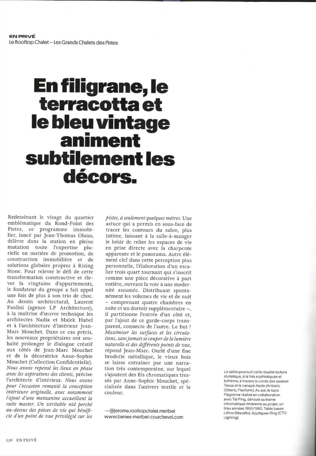French magazine Domodeco presents in their speical about luxury and moutains the Flagstone design from the André Fu Collection by Tai Ping. Surrounded mainly by wood, the carpet unfurls its inherent chromatic framework, in a 1950s/1960s blue tone.