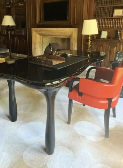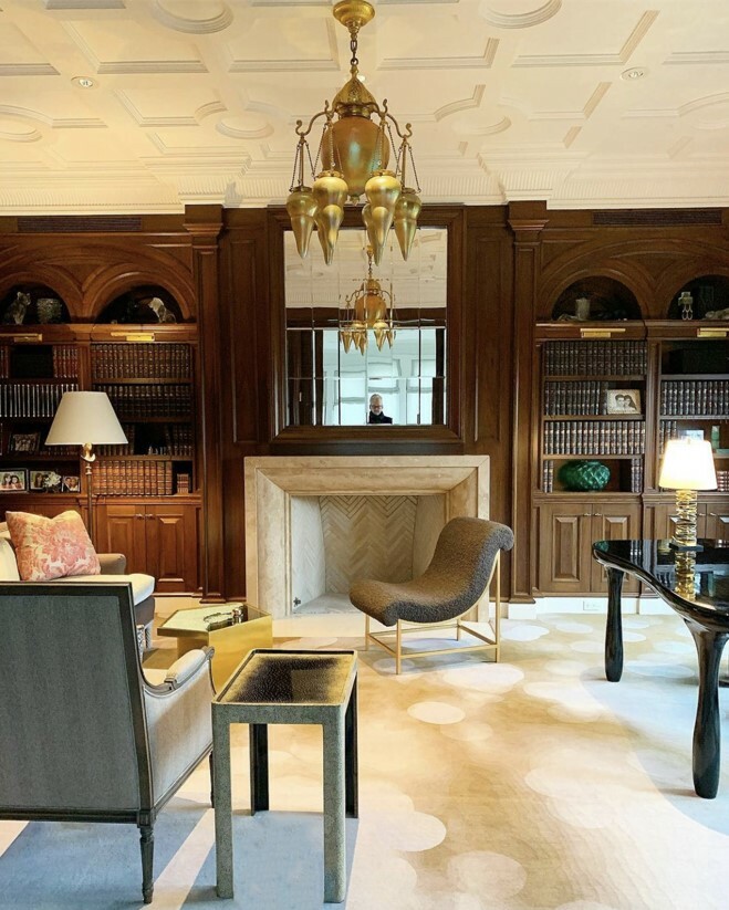 William McIntosh studio describes this design concept as: ” We love the English Baroque stylings of this Library but our very stylish client wanted it to be more sophisticated and artful. Our answer, a mix of classic Louis XVI style formal seating paired with a sculptural chair, lacquered desk and a modern hand tufted carpet. Your library should be a place that inspires and restores you mentally and spiritually. Creating an atmosphere that supports that was our goal for our client."