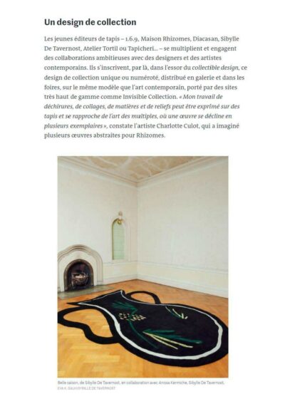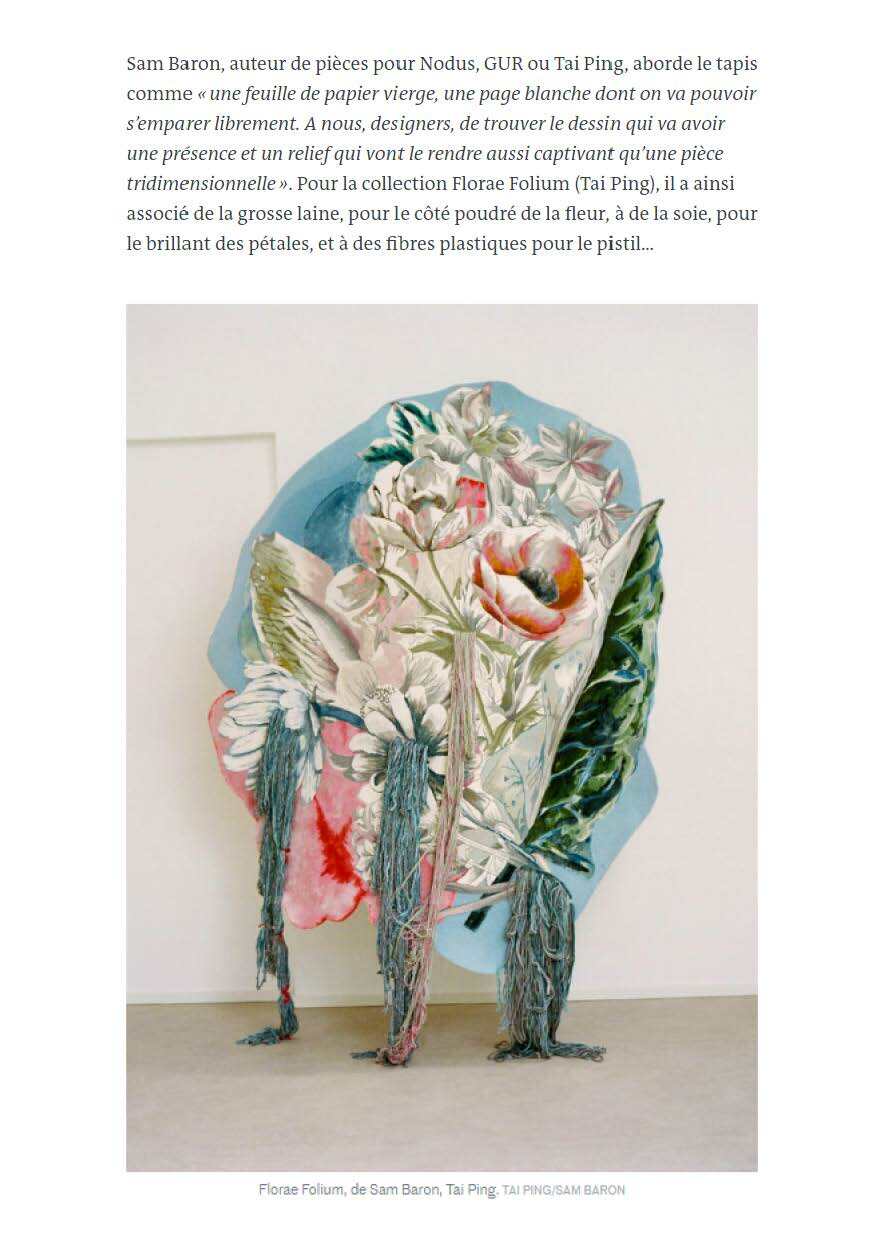 Le Monde showcases Tai Ping and his collaboration with Sam Baron, a french designer. The magazine presents one of the carpets from Florae Folium Collection: Regalis I.