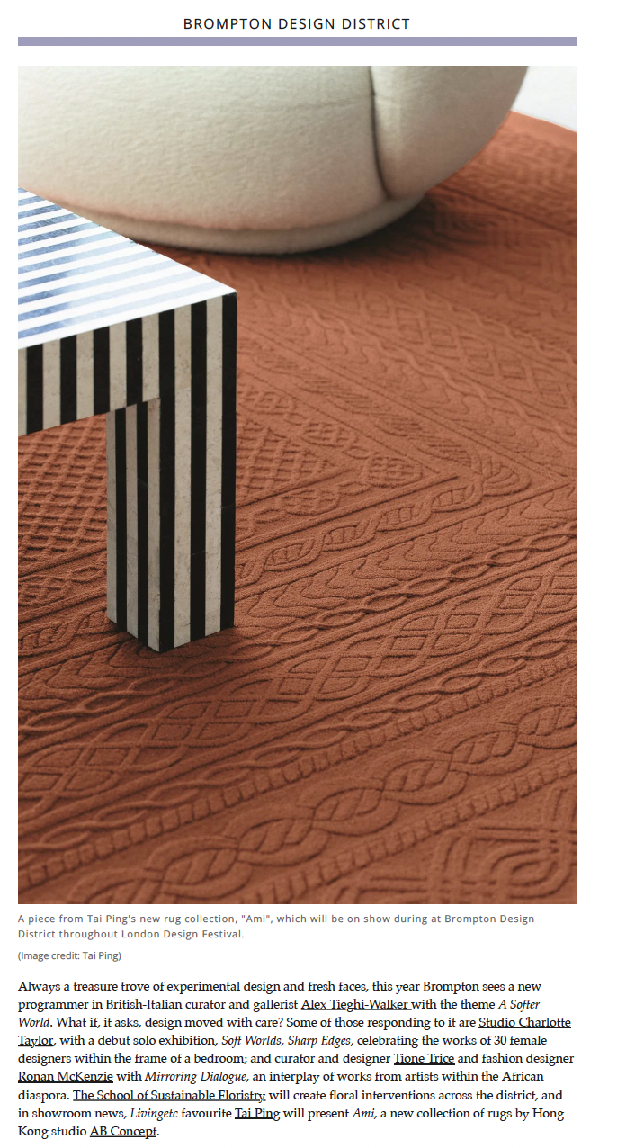 Livingetc features Tai Ping's new collection: Ami. Designed in collaboration with ab concept, the collection draws from the warmth of handcrafted knitwear and the elegance of natural materials. Each design reinterprets traditional cable-knit patterns through sculptural hand-tufted techniques and pure wool textures.