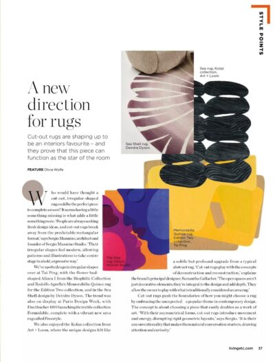 British magazine Livingetc features Alizea I from the Biophilic Collection and Memorabilia Quince from the Edition Two Collection by Tai Ping, highlighting the brand’s bold approach to cut-out rug design, where craftsmanship meets expressive form and innovation.