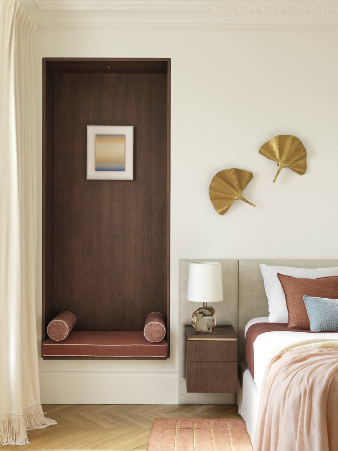 Within this dialogue between tradition and modernity, the choice of rugs plays a key role. Tai Ping’s Soft I, from the Biophilic Series, echoes the apartment’s organic fluidity with its gentle textures and muted palette. In the bedroom, the Solace II Madder design, woven from silk and Lurex, introduces a refined shimmer that balances softness and strength. Together, these bespoke pieces ground the interiors with a quiet sophistication, underscoring the designers’ talent for creating spaces that feel both composed and deeply alive.