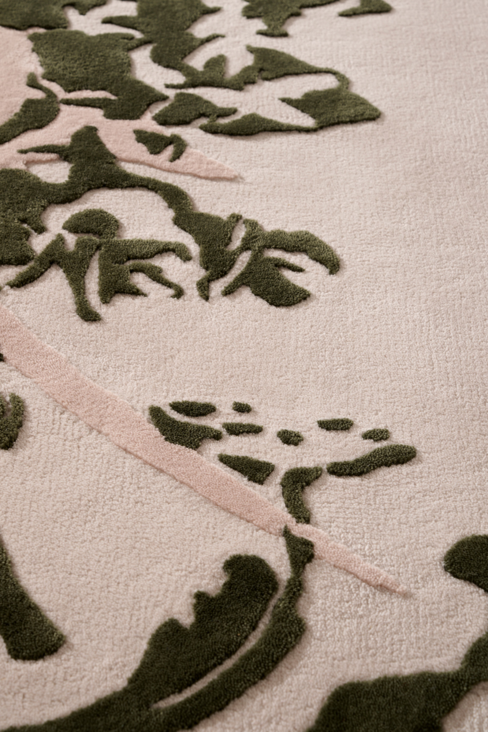 The lush border of foliage and shadows emphasizes with elegance the classical shape of the Ramosa Vivid design, made of wool and felted wool.
