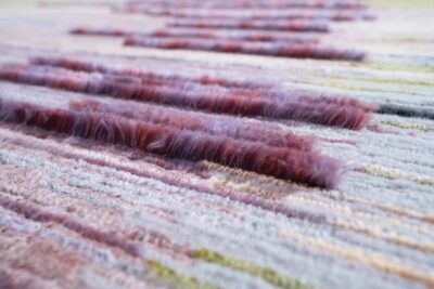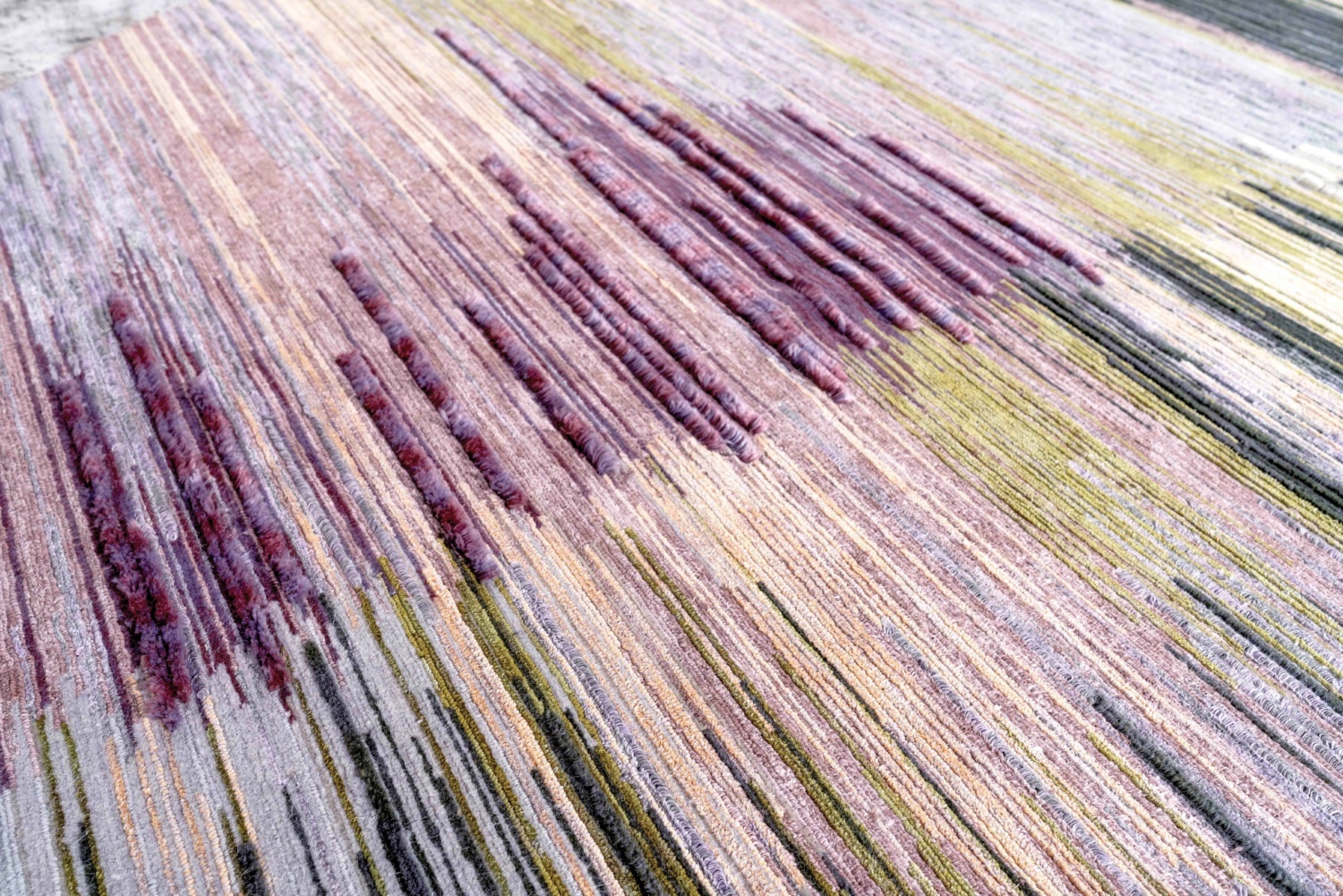 Raschel pops, making bold use of texture, colour, and shape. Created using an innovative three-way tie-dye technique, this oval carpet contrasts tones and pile height, achieving a vibrant effect.