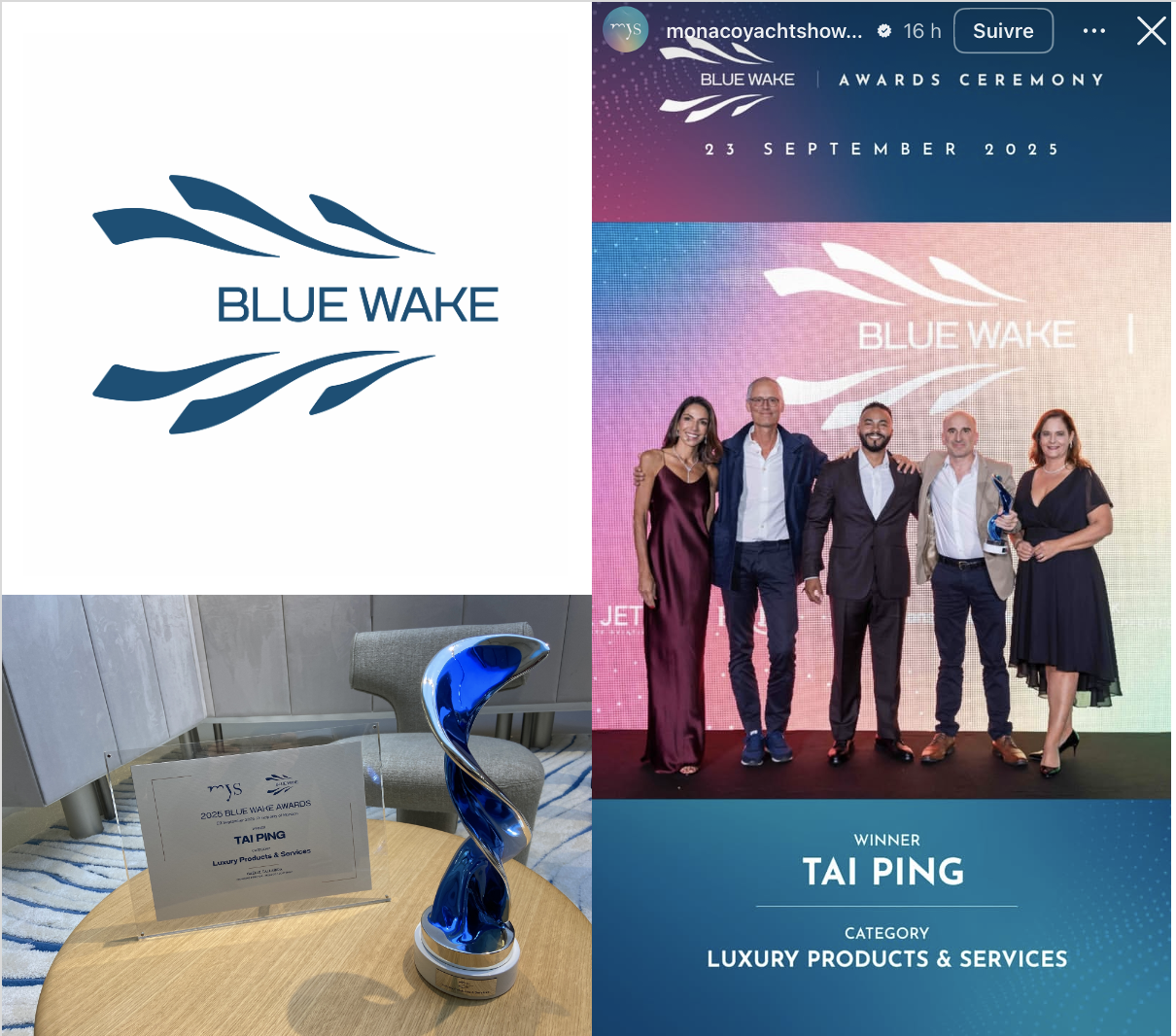 On 23 September, during the Grand Opening Night organised by the Monaco Yacht Show, Tai Ping was awarded the Blue Wake™ Award in the Luxury Products & Services category following deliberation by a panel of industry experts. The jury selected winners that demonstrate credible, high-impact innovations advancing sustainability.