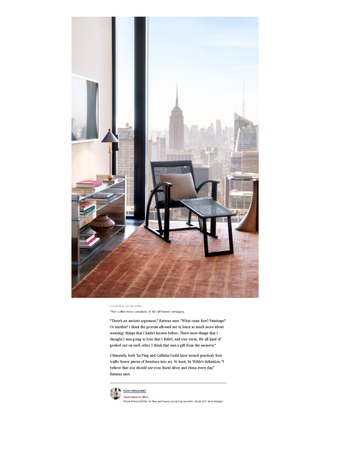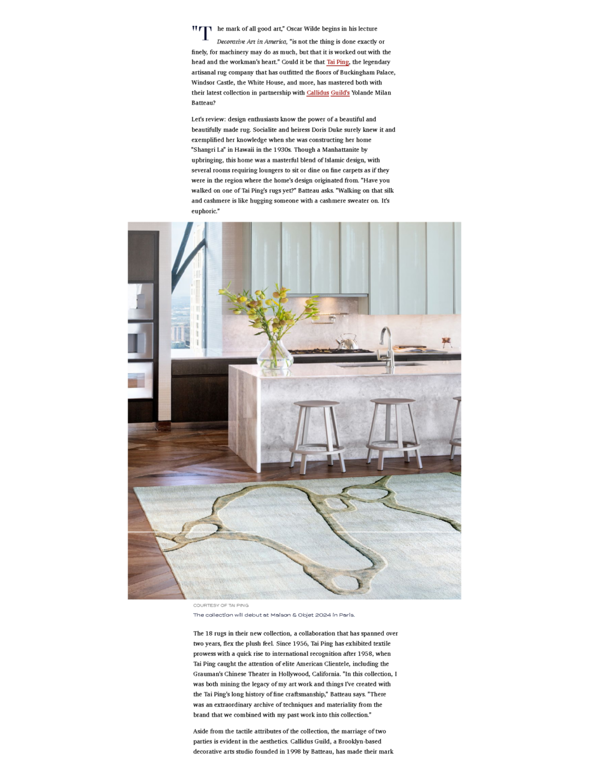 The US magazine Town & Country devotes an article of the collaboration between a decorative arts studio, Callidus Guild and Tai Ping. The lifestyle magazine explains the processus of the creation and deciphers all the carpets in the collection.